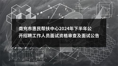 根据《南充市市属事业单位2024年下半年公开招聘工作人员公告》的规定,现将南充市惠民帮扶中心2024年下半年公开招聘工作人员面试资格审查及面试有关事项公告如下: